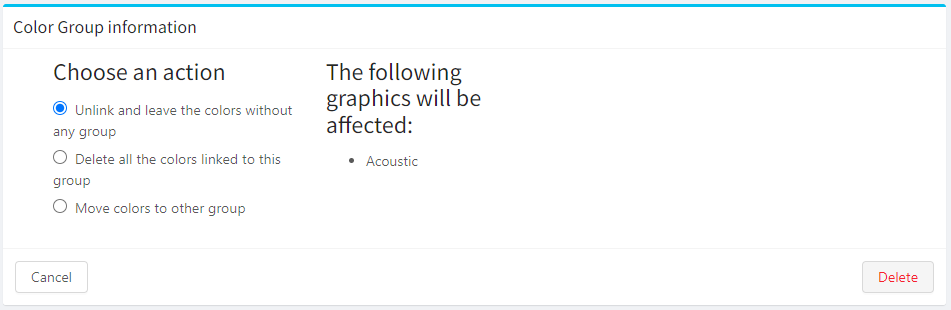 As colors may belong to color groups you should decide what to do with them when deleting the color group as this may affect the products. Choose one of the options: