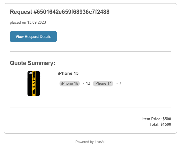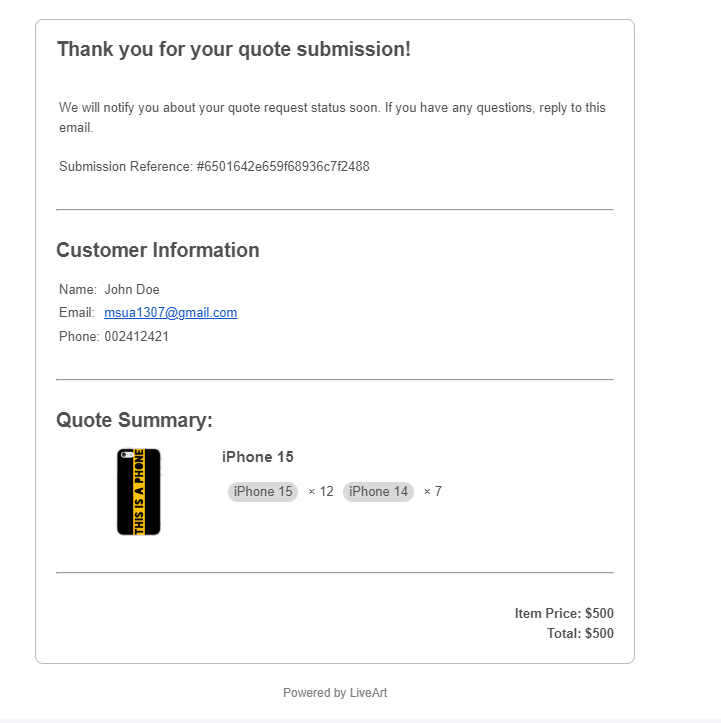 After submitting a quote request information will be sent to the Admin email, while the user will receive a confirmation of the quote request.