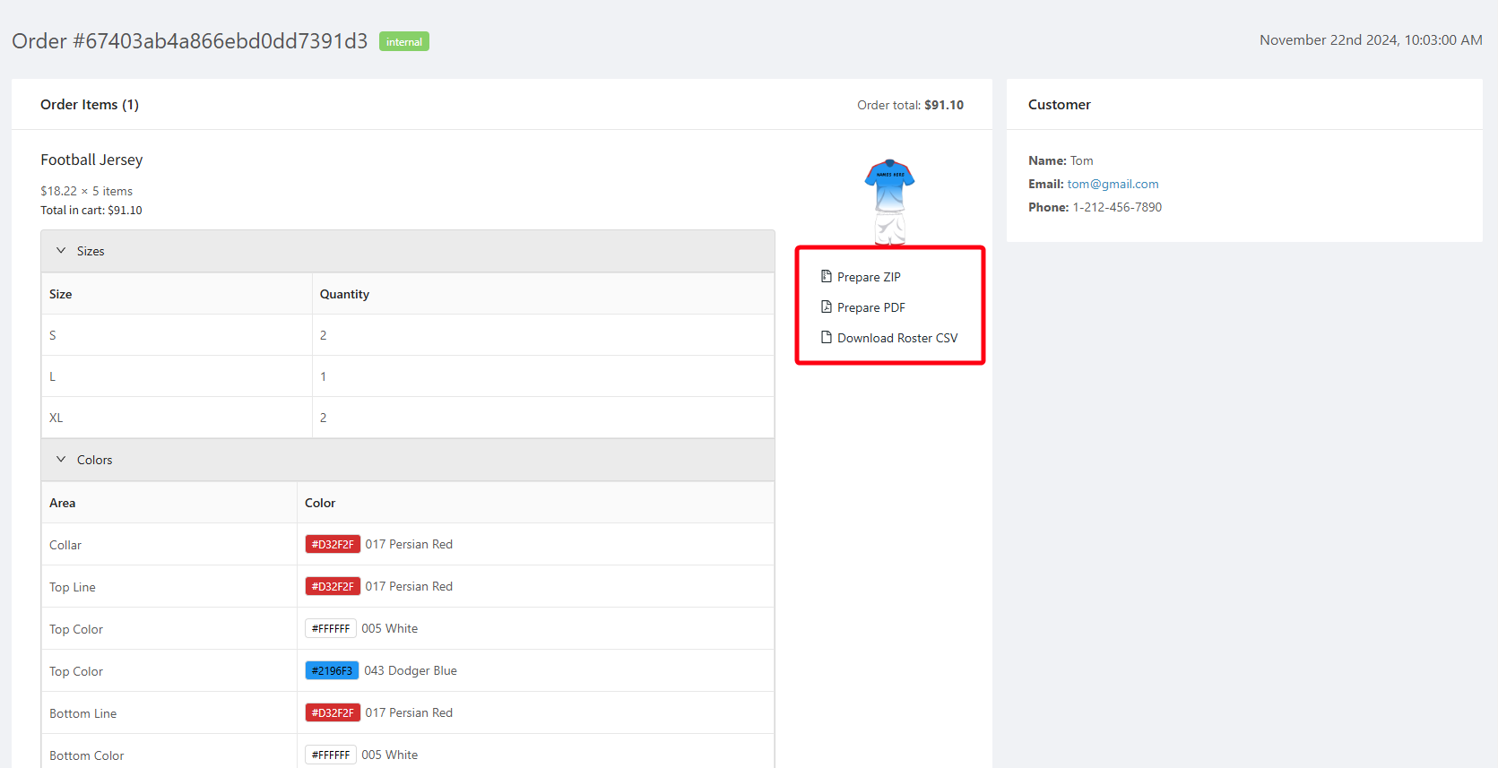 Download Roster CSV (available only for products with Names and Numbers) - csv file containing Name, Number, Size specified by the customer.