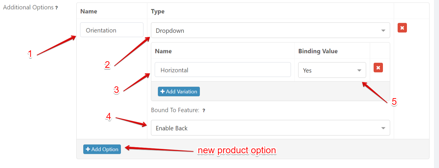 Choose "Bound to Feature" if appropriate. This means that selecting an option will affect product visualization or limitations of some decoration features. For example, you can choose "Enable Back" and bind this feature to the variation name. Then second (Back) location will be visible for this variation. If you do not bind "Enable Back" feature to the variation name there will be visible only Front location. Thus, you can make visible Front and Back location or only Front location according to specific variation.