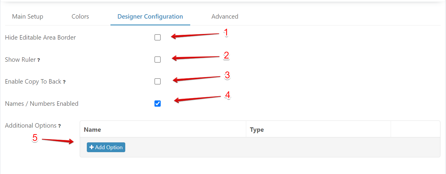 If you require to allow users add designs to the specific editable area, you can configure it on the Advanced Tab. In case of Main Setup, editable area is the whole canvas.
