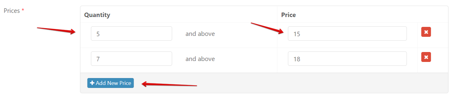 Prices. By default, the the price is $1 per product item. Enter the quantity of the product for which you want to set a fixed price, and set the respective price. You can add as many prices as you need, just click on "Add new price".